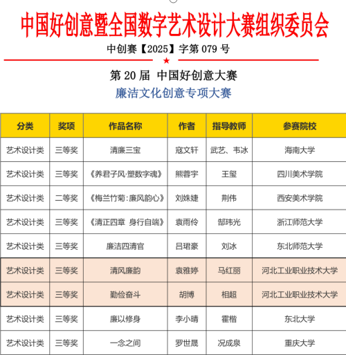 我院积极组织学生参赛,将赛事作为检验教学成果、锤炼学生实践能力的重要平台。在指导教师的悉心指导下,参赛学生深入挖掘廉洁文化的思想内涵,将“清风正气”“勤俭奋斗”等抽象价值理念转化为生动直观的视觉艺术作品。其中,袁雅婷同学的设计作品《清风廉韵》(指导老师:马红丽)、胡博同学的设计作品《勤俭奋斗》(指导老师:相超)均荣获国家级三等奖。这两件作品创意独特、设计精良,体现了思想性、艺术性与技术性的有机统一,获得了评审专家的认可。